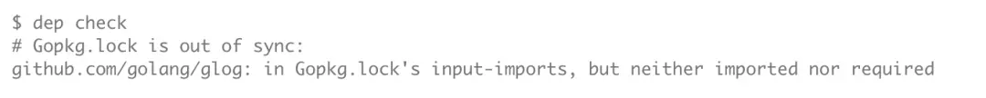 另外有一个 dep check 命令来检查是否存在依赖被引用,但是代码中并没有使用的情况,Go 语言对于依赖的引用比较严格,不允许引用了但是没使用的情况。从软件安全的角度考虑,这是一个很好的实践,避免引入一些安全风险。