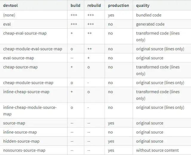 SourceMap的可选值如下(+号越多,代表速度越快,-号越多,代表速度越慢,o 代表中等速度)