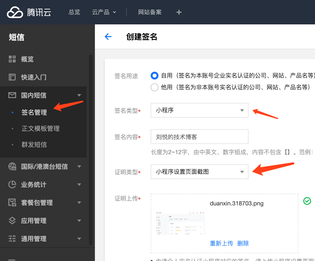 之后配置短信的签名,签名顾名思义,用来限制短信接口的权限,防止被恶意调用,同时签名需要腾讯客服人工审核,大概需要两个小时左右。