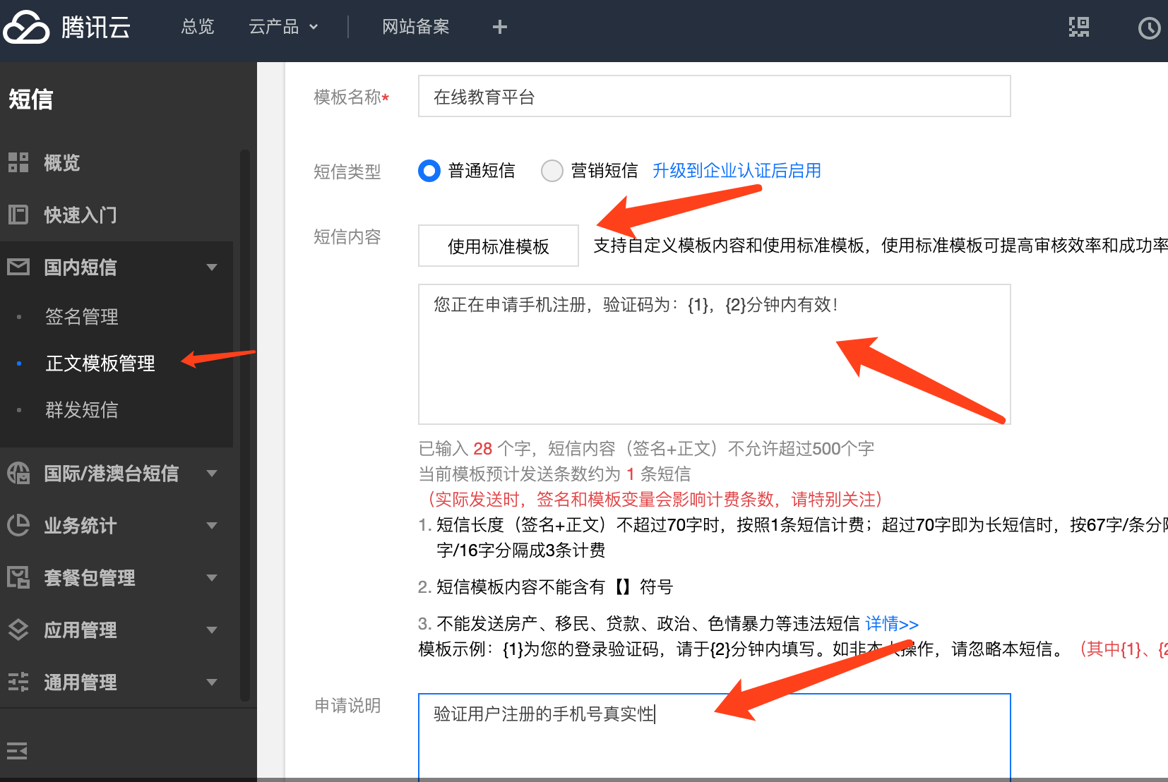 模板中的{}符号是类似通配符的东西,发送短信时用变量进行替换,注意表明索引数量,模板也需要腾讯客服人工审核,大概需要两个小时左右。另外短信长度最好不要超过70字,超过以后长短信就会按每67字一条来计算,那就亏大发了。