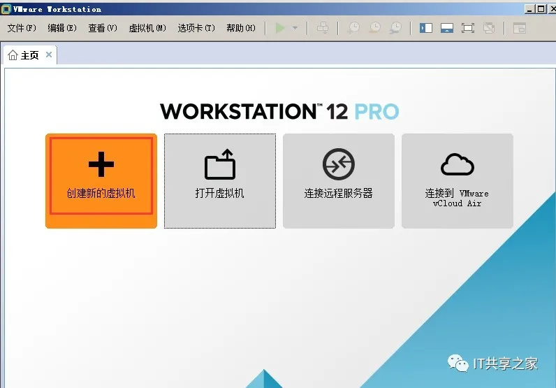 1、之后打开VMware,主页面如下图所示。点击第一个框框,“创建新的虚拟机”。