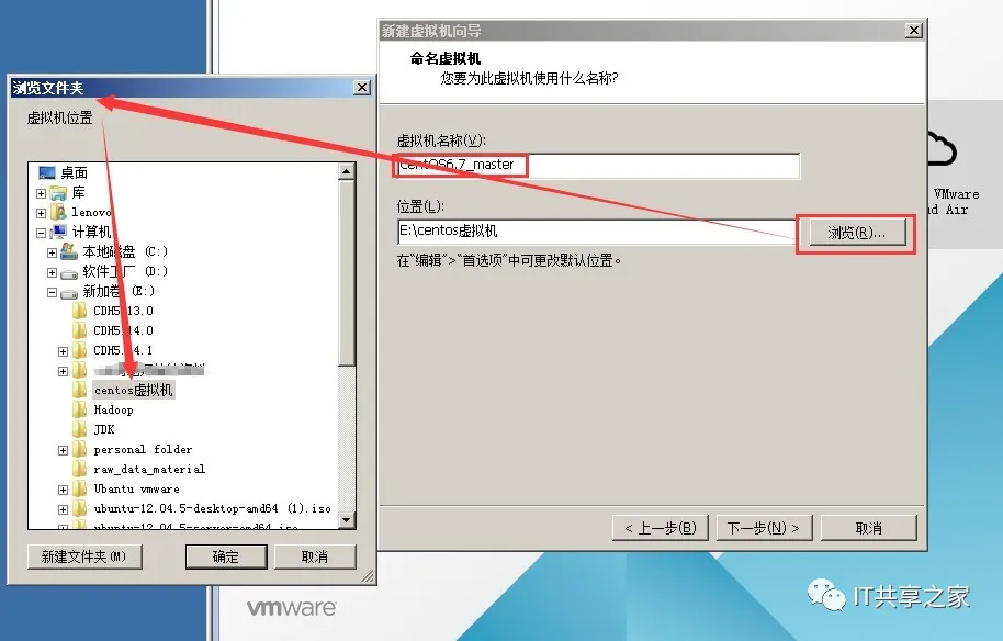 7、虚拟机名称可以自定义,不多赘述,这里将其命名为master,后期作为集群的管理节点用的。虚拟机蛮占内存的,所以安装位置不建议放到C盘,建议放到其他的盘内,且要保证该磁盘的空间至少要大于虚拟机的大小。这里,小编将虚拟机放到E盘。