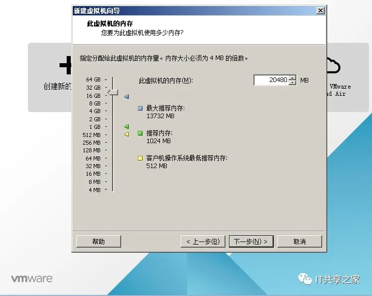 10、虚拟机内存默认为2G。同上一步一致,要求不高的话直接默认即可。在这里小编选择了20G,大家可以根据自己的要求进行选择,要保证磁盘大小够用噢,之后选择“下一步”。