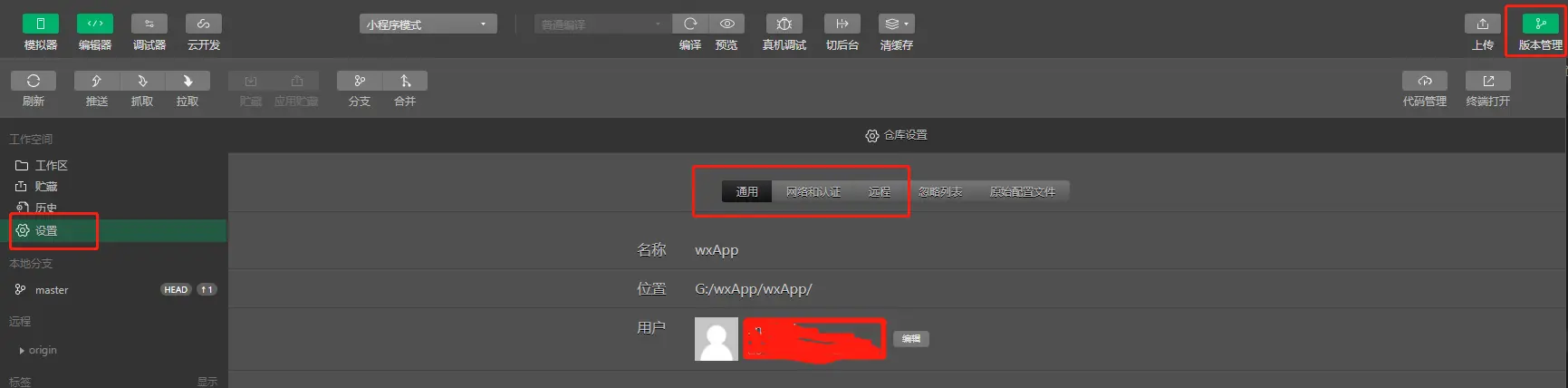 1、版本管理 > 设置 > 通用 > 用户 中修改成自己码云中账号和密码