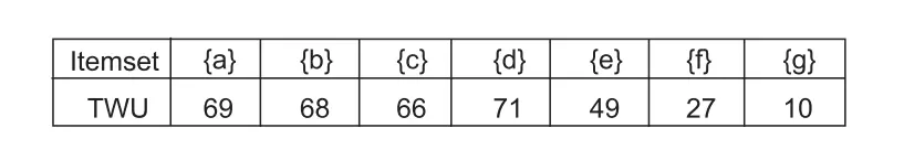 - 求出所有项目的TWU(i) 。如果项目i的TWU低于所给出的阀值,那么将不再考虑任何包含有 i 的项目集。