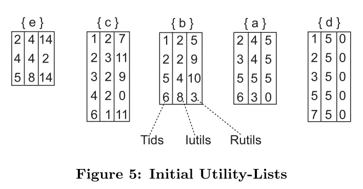 - 每个生成效用列表tids对应的iutils,由两项目集对应tids的iutils相加而成