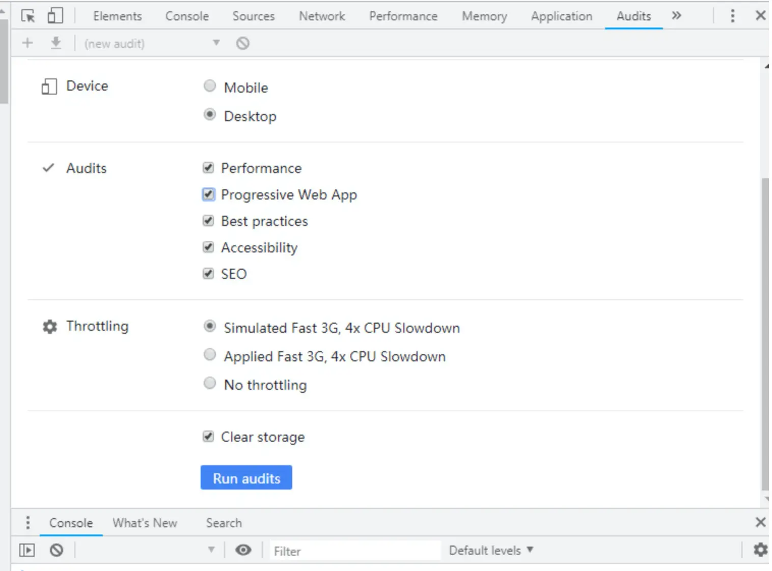 其次,在chrome浏览器中打开你需要测试的网站,按f12进入开发者调试模式,点击‘Audits’选项,看到如下界面: