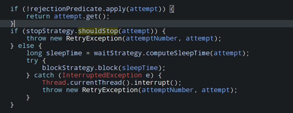 在下面就是在尝试,可以尝试就返回结果。不能尝试就走下面的是否应该停止,要是可以停止的话,就抛出retry 异常,