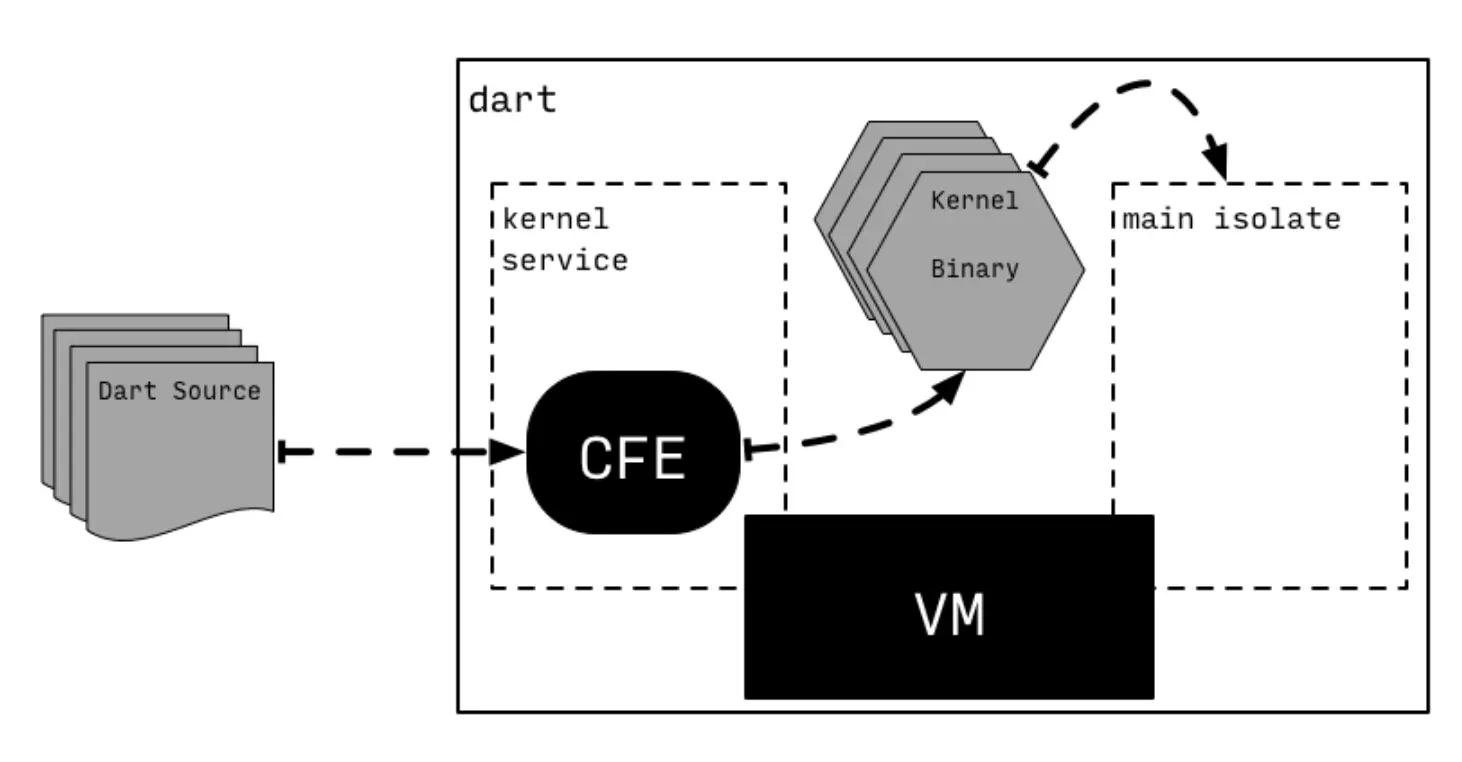 kernel-serivce主要用于将.dart文件编译为kernel文件,一个.dart从文本到可执行的流程如下: