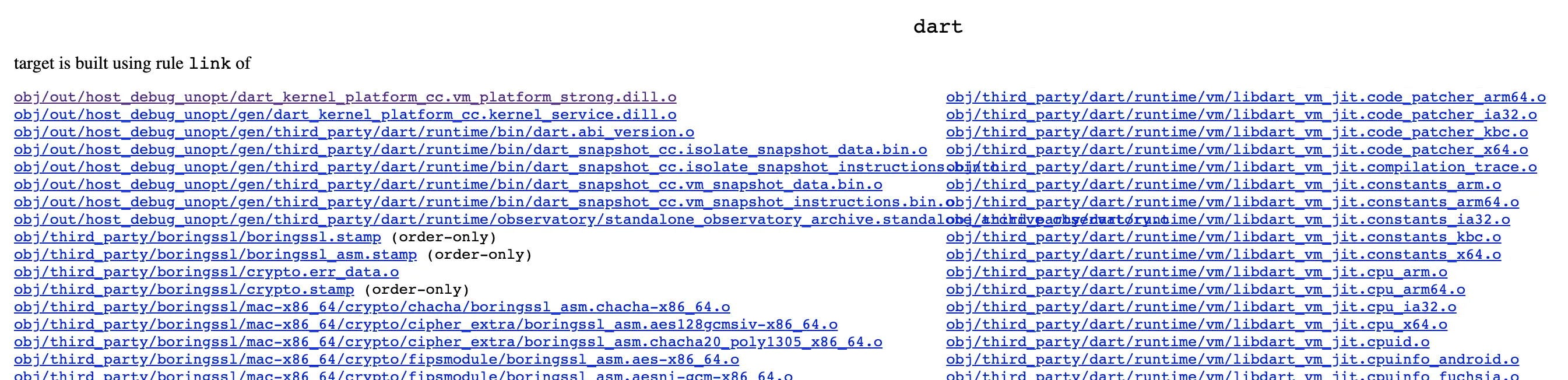 Dart是使用GN构建的,GN的特点不仅是跨平台,他可以在构建的中间过程执行各种规则命令包括Python脚本,这也增加了阅读复杂性,好在谷歌有自知之明做了一些辅助工具,在src目录下,我们执行一下命令: