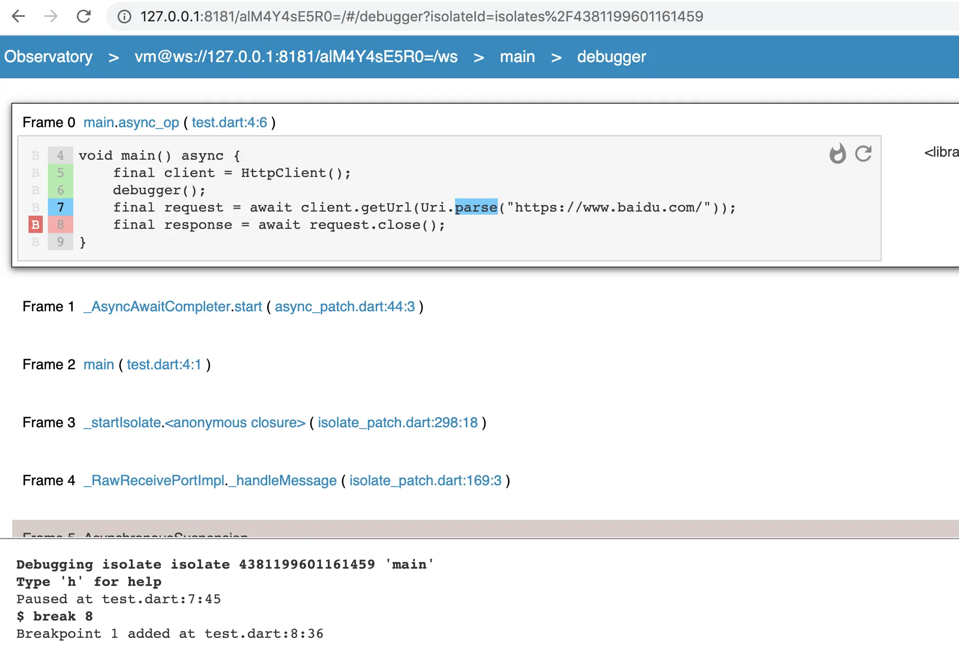 在执行我们调试代码的时候,主isolate加载的是移除了source后的内置库,所以断点无法生效也是正常的。