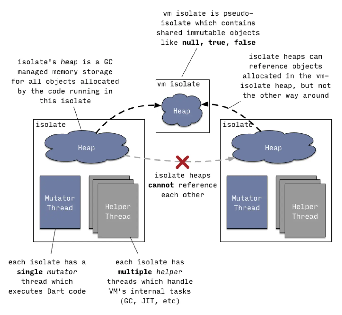 一个dart程序由一个vm_isolate和一个或多个isolate组成,vm-isolate的数据和代码被所有isolate共享,结构如图: