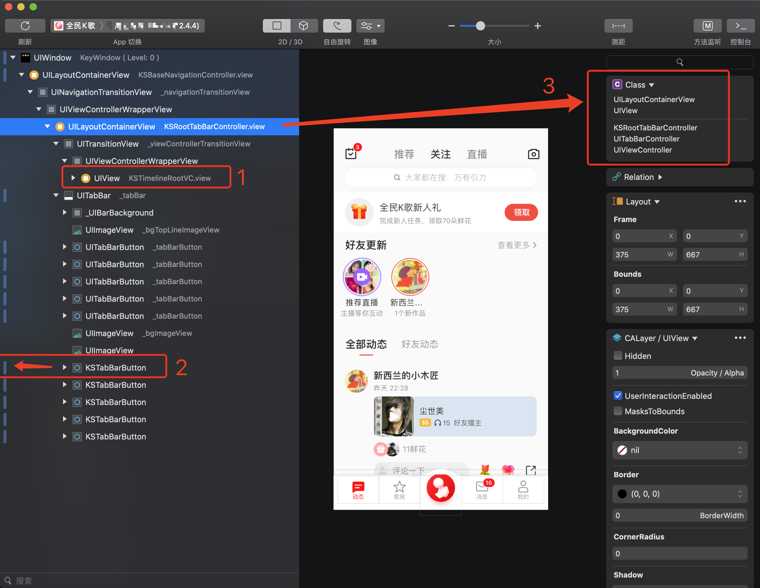 1.左侧的那个图标表示该View是某个VC的view,这里view的VC的名字就是 KSTimelineRootVC。