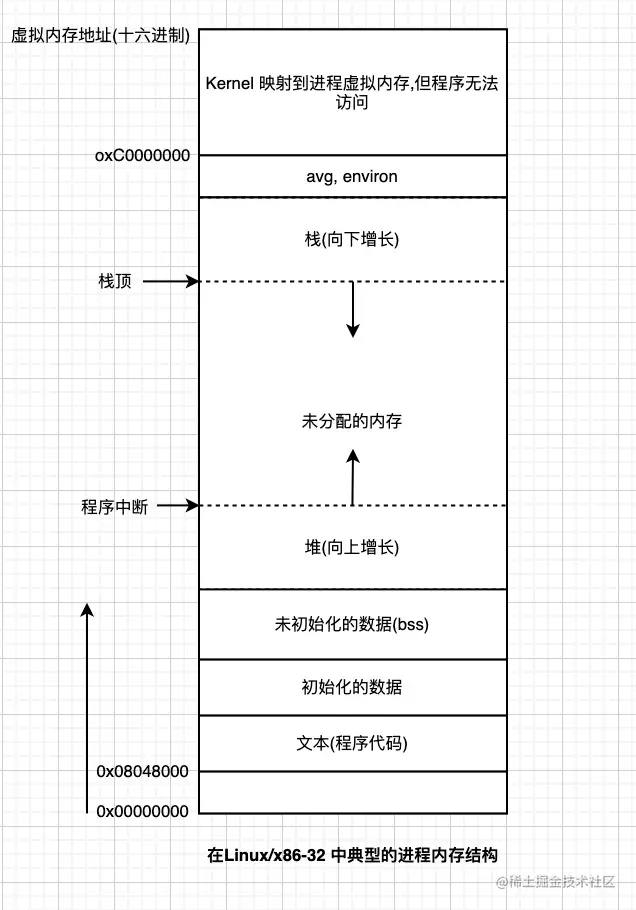 下面是在 Linux/x86-32 中典型的一个进程内存结构