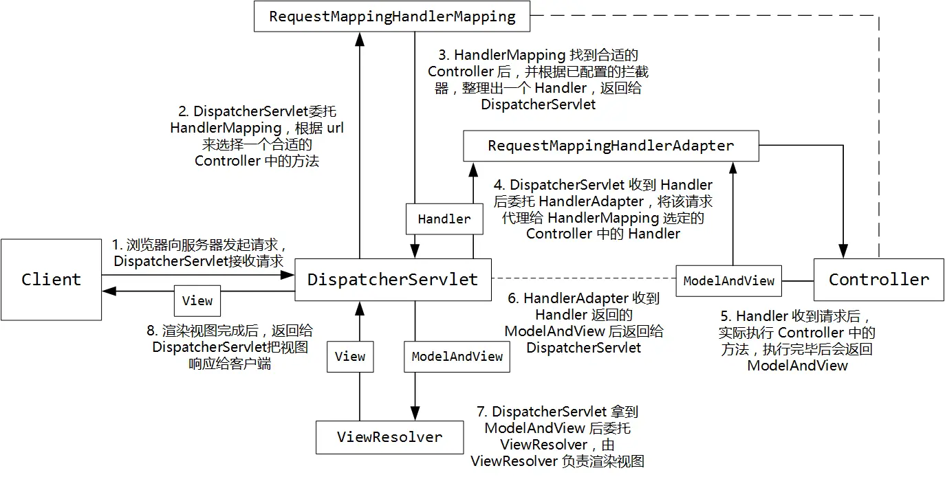 在 DispatcherServlet 的核心工作流程中,委派模式体现在 HandlerMapping 、HandlerAdapter 、ViewResolver 接受 DispatcherServlet 的委派,如下面的整体流程图: