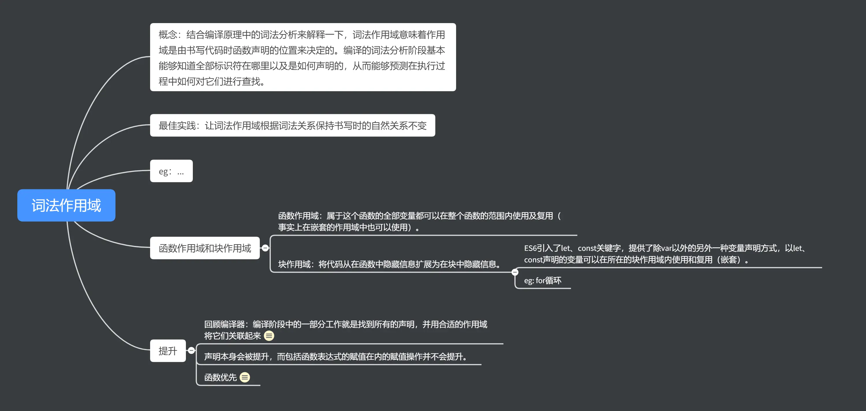- 词法作用域是定义在词法阶段的作用域, 换句话说就是你写代码时将变量和块作用域写在哪里决定的. JavaScript 可以通过