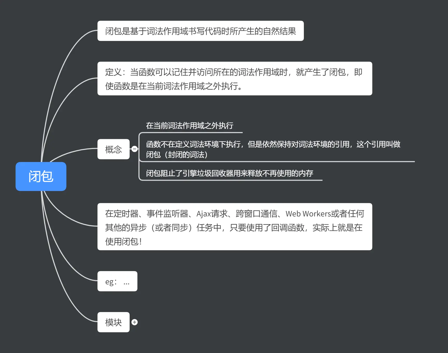 ❝当函数可以记住并访问所在的词法作用域时, 就产生了闭包, 即使函数是在当前词法作用域之外执行. -- 《你不知道的 JavaScript(上卷)》