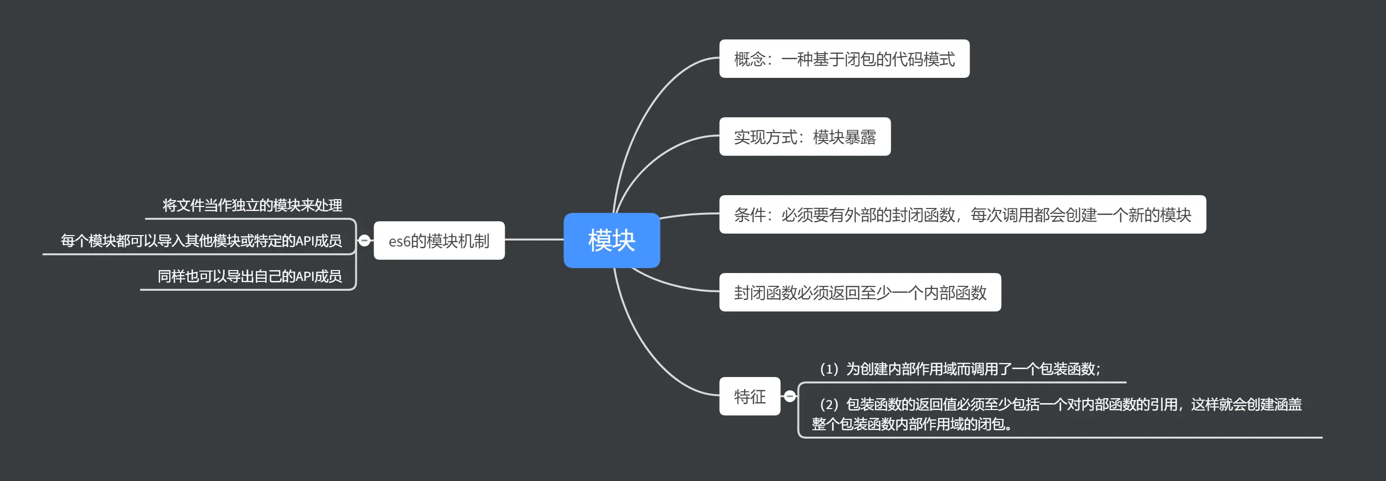 特征 - (1)为创建内部作用域而调用了一个包装函数,该函数必须至少被调用一次(每次调用都会创建一个新的模块实例); - (2)包装函数的返回值必须至少包括一个对内部函数的引用,这样就会创建涵盖整个包装函数内部作用域的闭包。