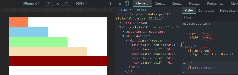 比如设计稿的为375px格式的,那么引入这个 flexble.js 以后,根节点的 font-size:37.5px(1rem),接下来先看下代码和效果来验证这个关系