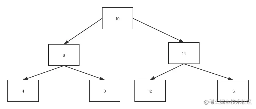 先访问根节点,再访问左子节点,最后访问右子节点 10,6,4,8,14,12,16