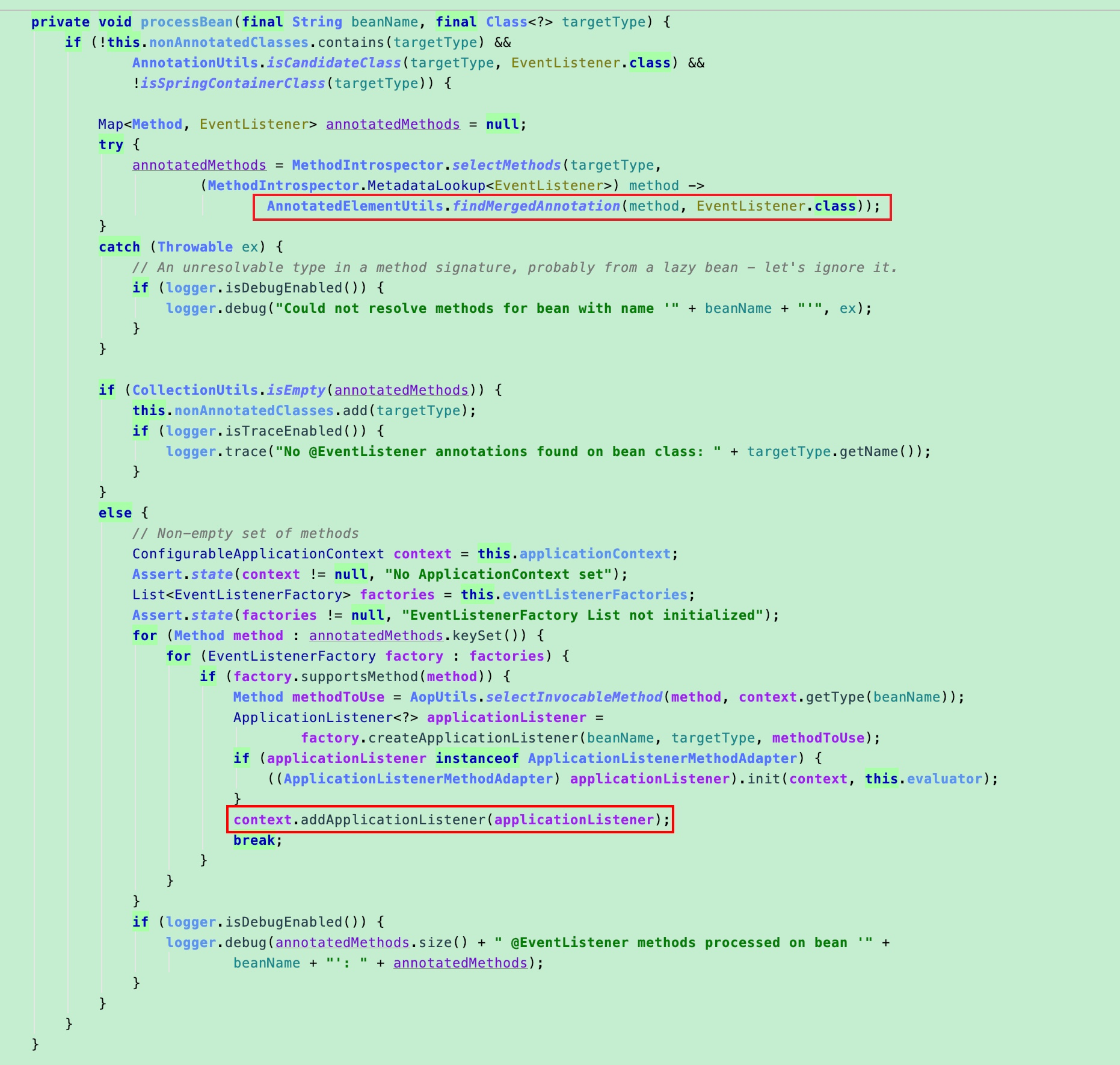 在这里,查找使用了@EventListener注解的方法,找到后同样会添加到ConfigurableApplicationContext(ApplicationContext的实现类)中,