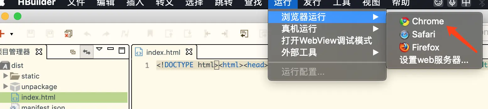 这时系统会帮你创建一个配置文件manifest.json,转换完毕之后,点击index.html,选择运行,浏览器运行,进行测试