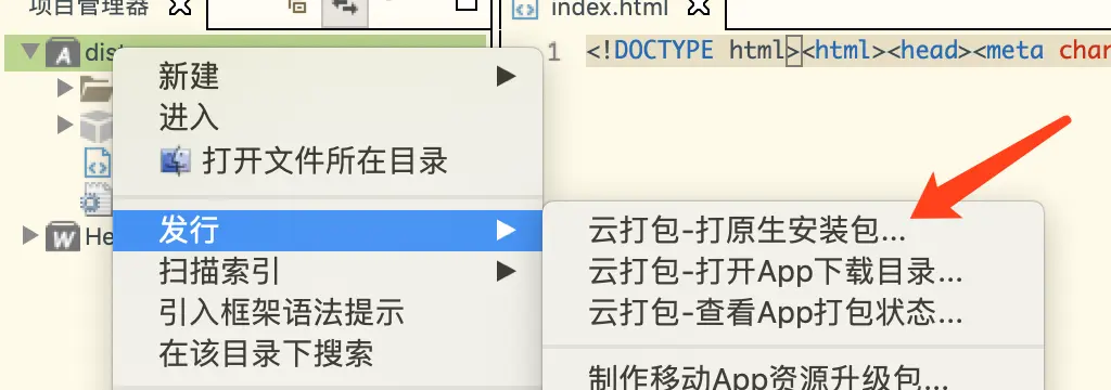 如果是空白页面就要修改vue.js中的配置文件,看看有没有改成相对路径,测试没问题之后进行打包,选择dist文件目录,右键生成发行原生项目