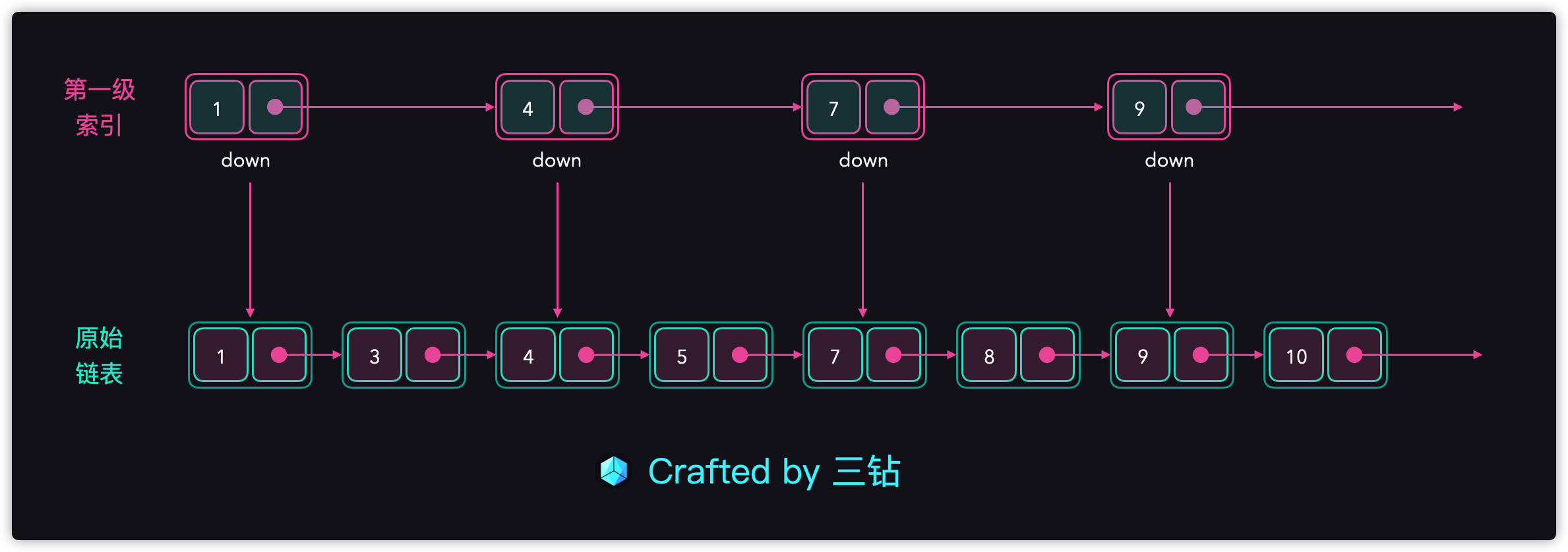 - 二级索引的第个人结点指向的就是结点7,因为二级索引是next+2,每次跳3步的进行步伐;