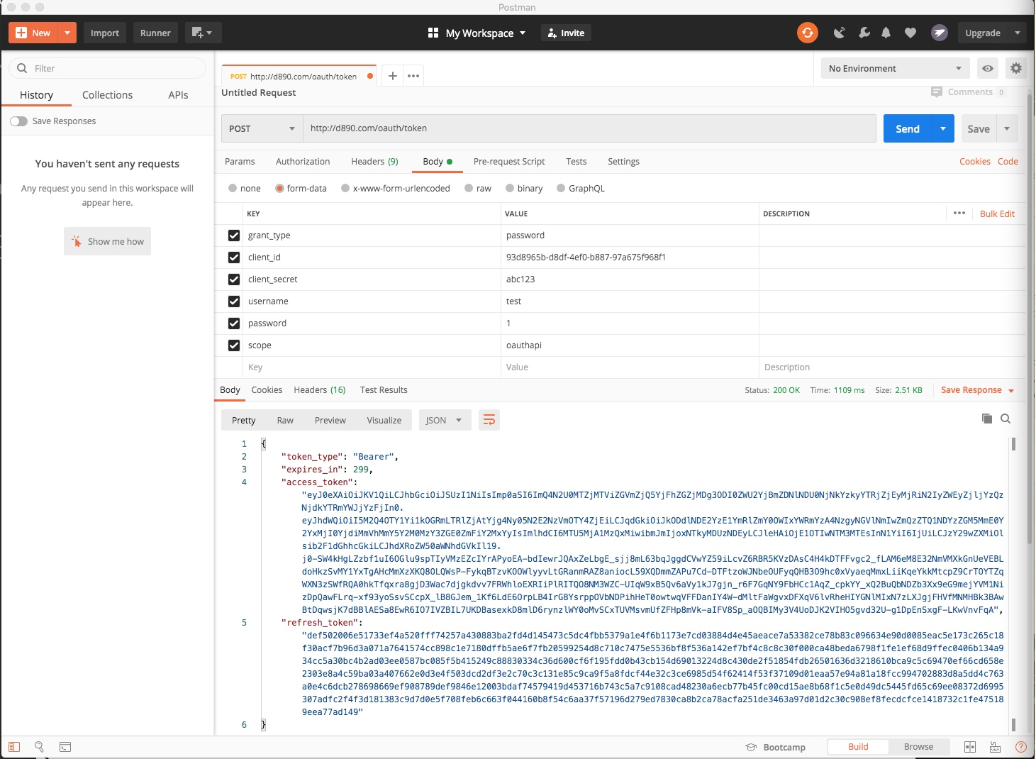 现在,我们已经配置了简单OAuth模块,我们需要从位于的资源请求访问令牌/oauth/token。OAuth 2.0规范规定,授权服务器上的OAuth令牌资源必须仅接受POST其主体格式为form-data或的请求x-www-form-urlencoded,并且所有JSON格式的主体都将被拒绝。