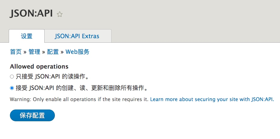 JSON:API 是一个零配置模块,该模块提供对所有Drupal实体的访问权限,以进行即用型读取。但是,您不仅应考虑读取数据,还应考虑创建或更新数据的可能性。 启用后,您需要转到模块设置页面(/admin/config/services/jsonapi),并将“ 允许的操作 ”字段更改为“ 接受所有JSON:API创建,读取,更新和删除操作 ”值。