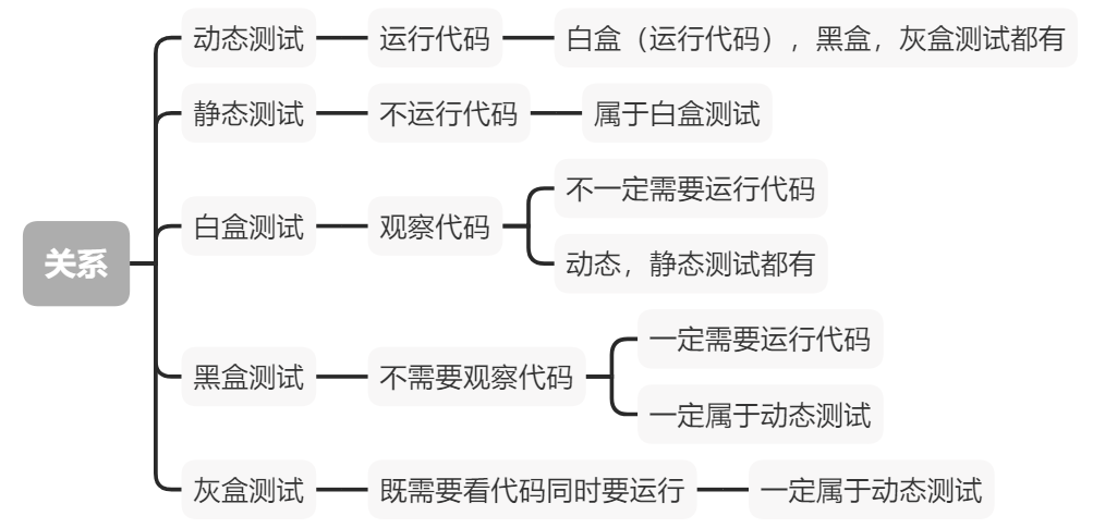 最后,前面的文章里,对测试方法按是否查看代码划分,有黑盒测试、白盒测试、灰盒测试,那么,它们与今天的静态测试、动态测试,有什么关系呢?下面,我整理了一张图,以供大家理解。