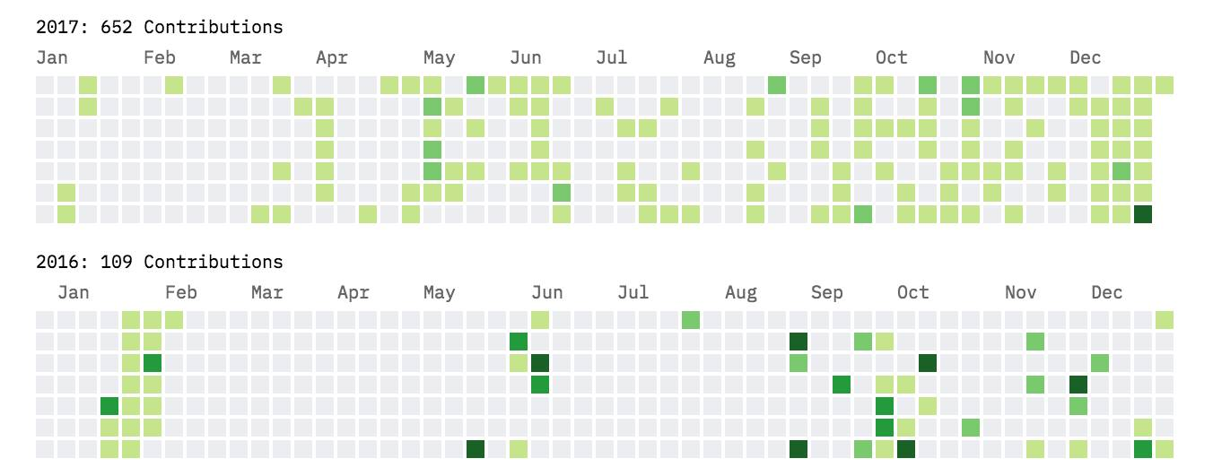 2016 年和 2017 年我在 GitHub 的贡献对比。