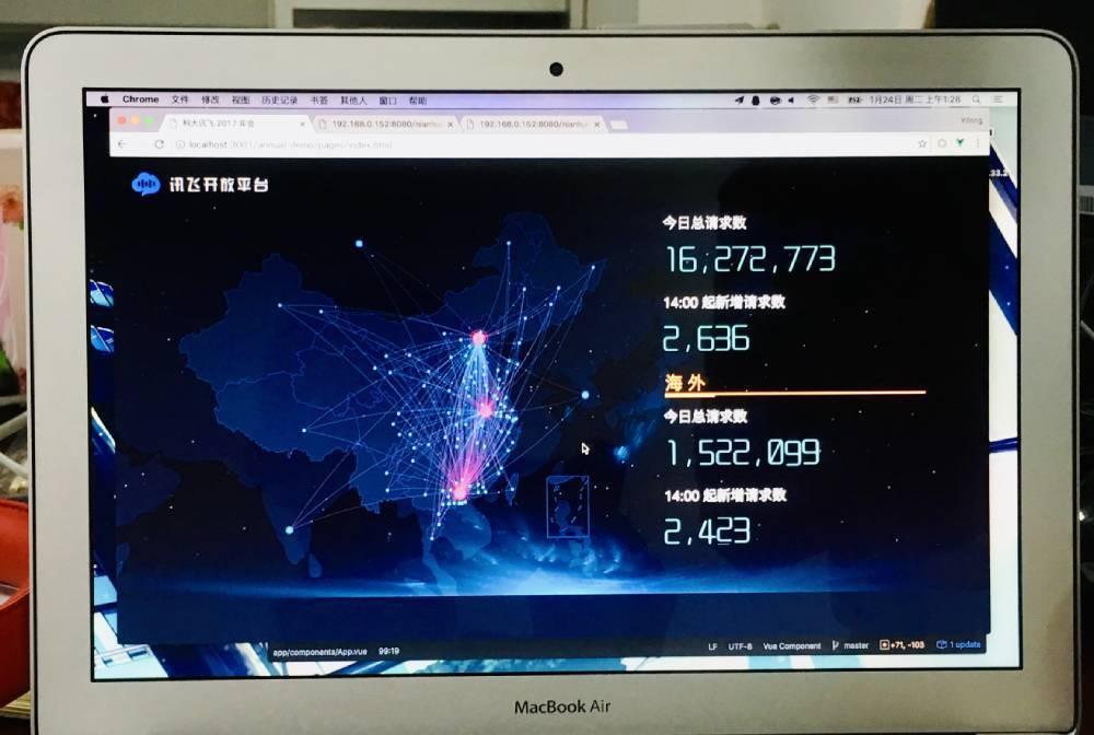 一张调试 2016 年会大屏 Demo 的照片。那是我在讯飞最忙的 24 个小时,也是唯一一次直接和董事长汇报工作。