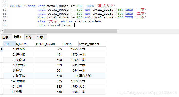 WHERE u.create_time >= '2020-01-01'- 情景2:有个学生高考分数表,需要将等级列出来,650分以上是重点大学,600-650是一本,500-600分是二本,400-500是三本,400以下大专;