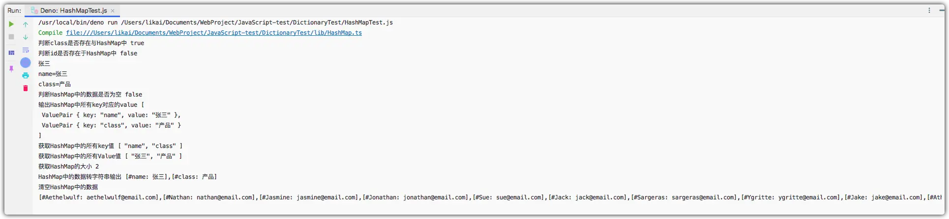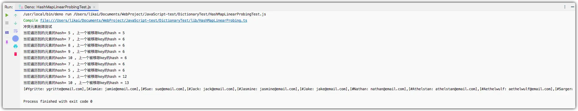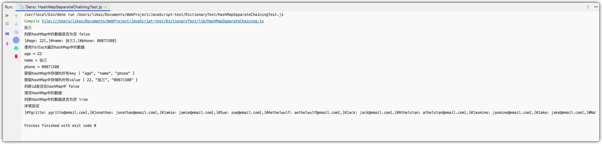 我们在上述代码中实现了djb2HashCode方法,此方法产生重复的hash值的概率很小,因此我们应该使用此方法来生成,接下来我们将hashCode使用的方法改为djb2HashCode,测试下HashMap的执行结果。