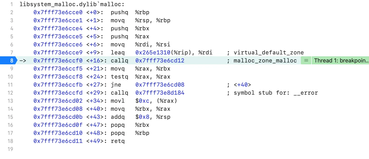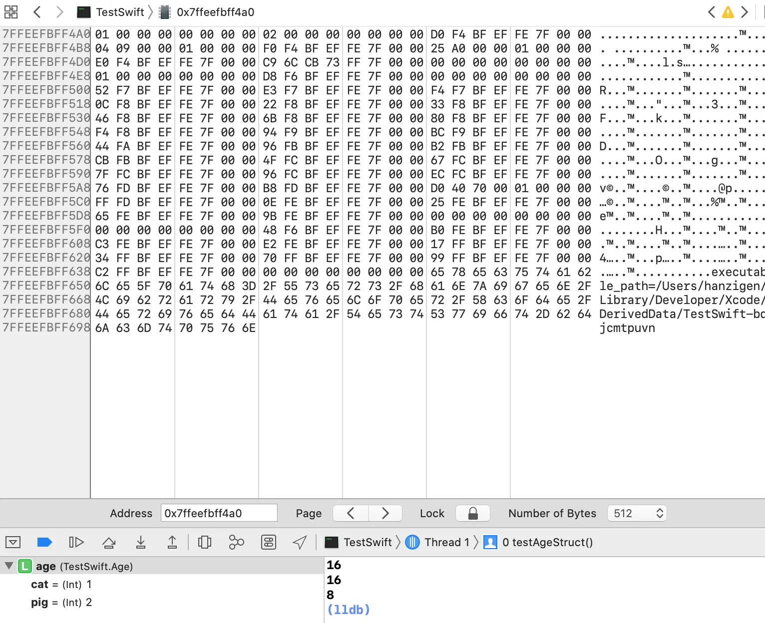 内存地址为0x7ffeefbff4a0,内存中的内容为所在地址的16字节,如下图