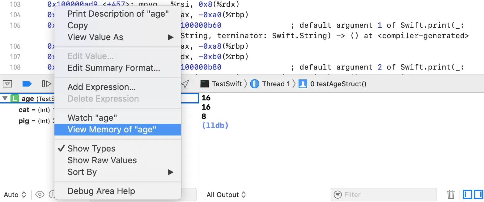 另外,可以通过选中age,右键->View Memory of "age"查看内存