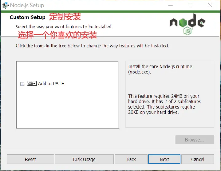 选 “Add to PATH ”,下一步,它会将Node.js,npm, 在全局初始化,并将其添加到环境变量中。
