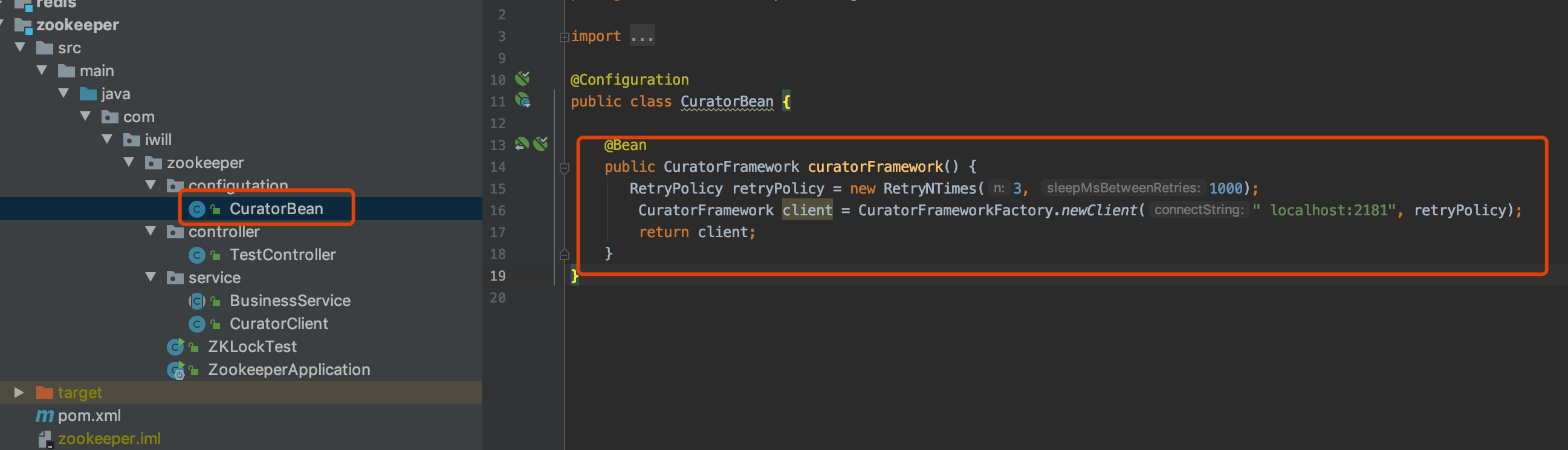 CuratorFramework client = CuratorFrameworkFactory.newClient("127.0.0.1:2181",