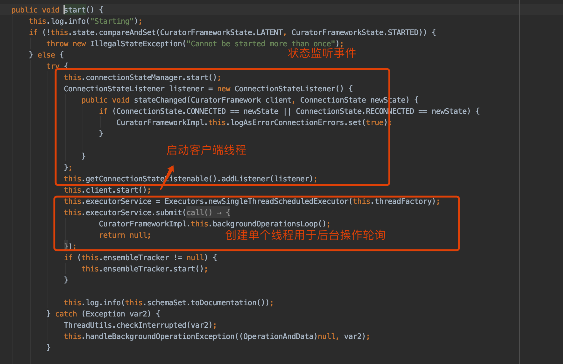 在client.start调用后,就会创建与zookeeper服务器之间的会话链接