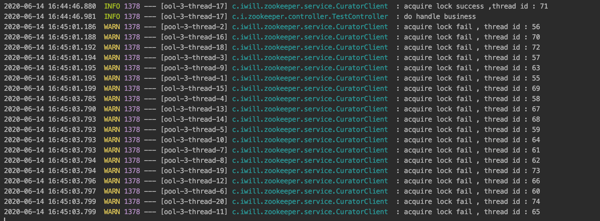 20个线程同时获取锁 会在/lock-path下面创建20个临时节点 序号从0-19 只有创建序号0的临时节点的那个线程才会成功获取得锁 其他的没有获取锁的临时节点会删除