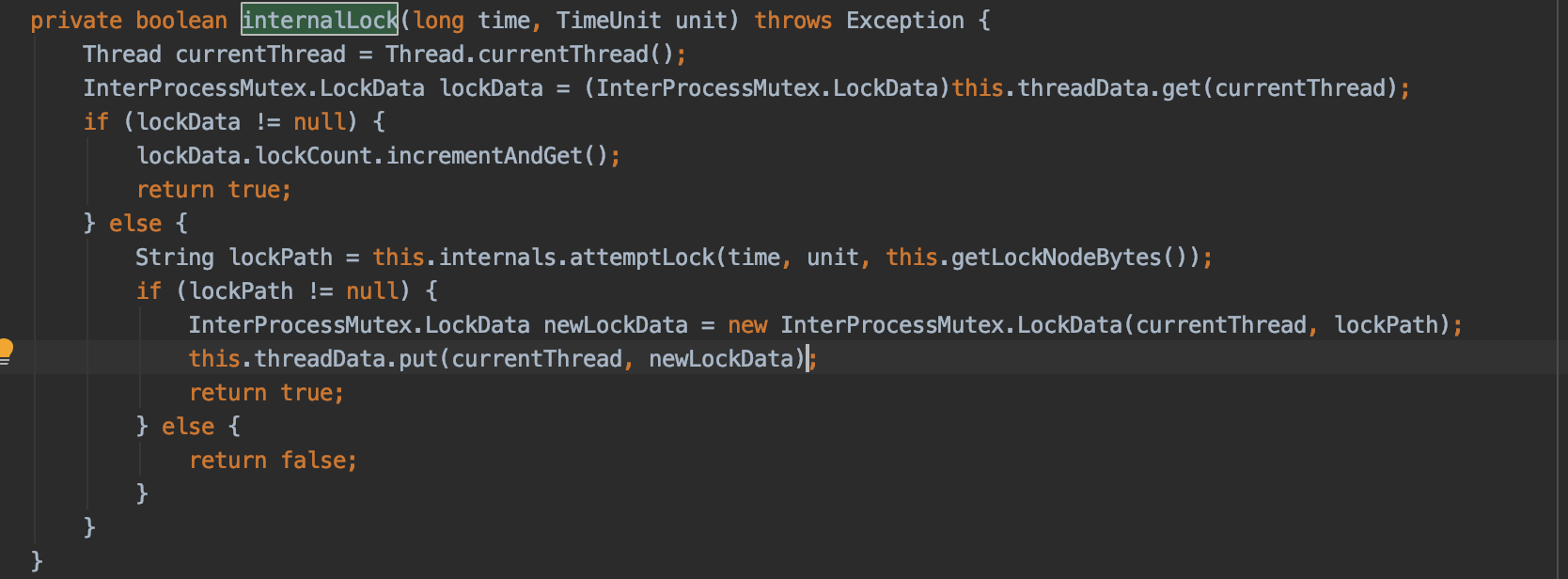跟踪获取锁的代码进入到org.apache.curator.framework.recipes.locks.InterProcessMutex#internalLock