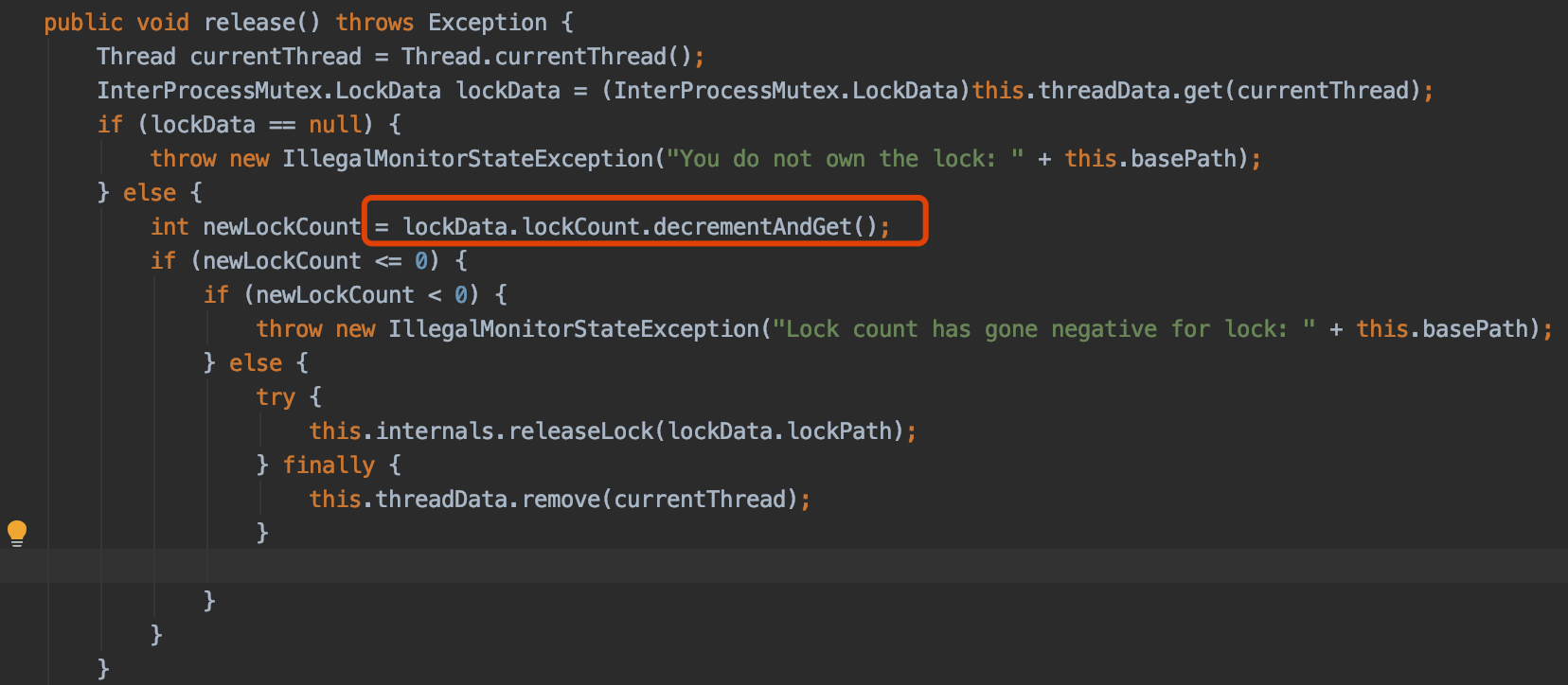 可以看见zookeeper的锁是可重入的,即同一个线程可以多次获取锁,只有第一次真正的去创建临时会话顺序节点,后面的获取锁都是对重入次数加1。相应的,在释放锁的时候,前面都是对锁的重入次数减1,只有最后一次才是真正的去删除节点
