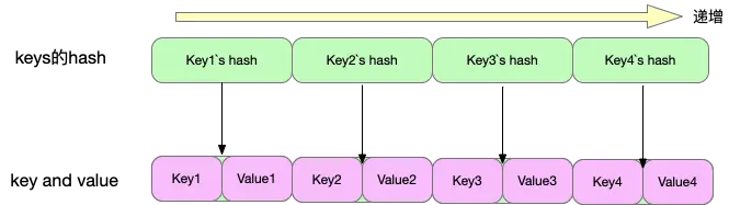 - 用数组实现,key递增插入数组,通过二分查找实现遍历,不同于HashMap的数组+链表/红黑树,因此时间复杂度低于HashMap