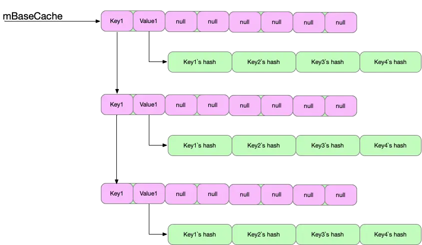 ArrayMap全局存在两周缓存池,避免了频繁分配数组对象带来的开销,分别为数组对象长度为4和8的对象缓存,缓存最大容量都是10,可以思考下为什么仅仅缓存长度为4和8都数组对象?(猜测1⃣️是ArrayMap默认的容量是4、8、1.5n增长,大多数场景下存储数据比较小,集合大小为4和8可以满足,容量太大考虑到时间复杂度也不建议使用ArrayMap存储;2⃣️存储更大容量的数组对象会占用太多内存,在时间和空间需要做折衷处理,更好的做法是支持扩展内存池)