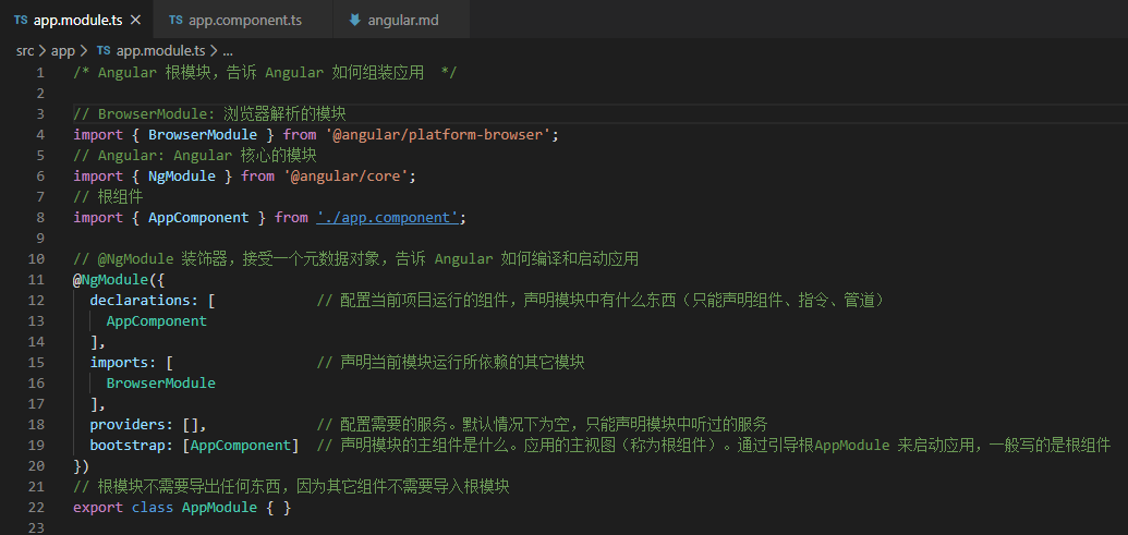 app.module.ts 模块 与AppComponent类似,模块也需要装饰器来装饰。
