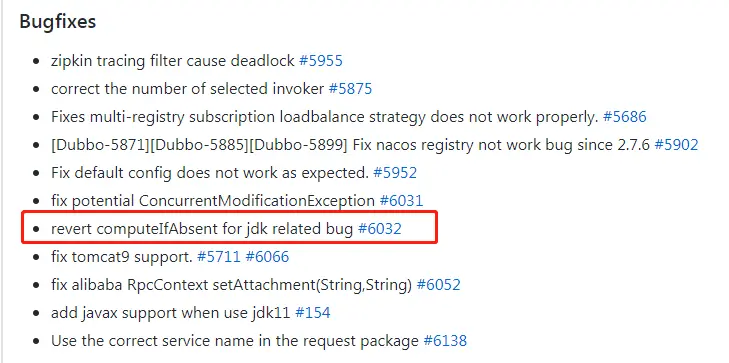 每一个我都去简单的看了一下,其他的 Bugfixes 或多或少都和 Dubbo 框架有一定的关联性。但是上面红框框起来的部分完全就是 JDK 的 Bug 了。