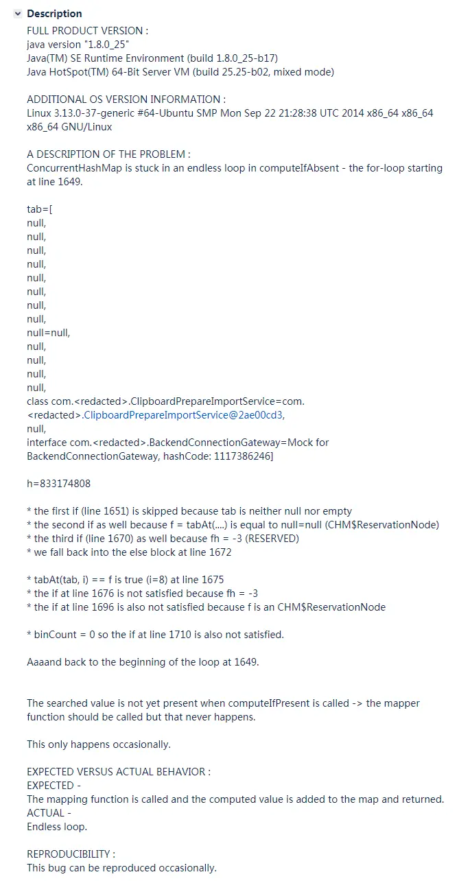 我们可以看到:这个 Bug 是位于大名鼎鼎的 concurrent 包里面的 computeIfAbsent 方法。