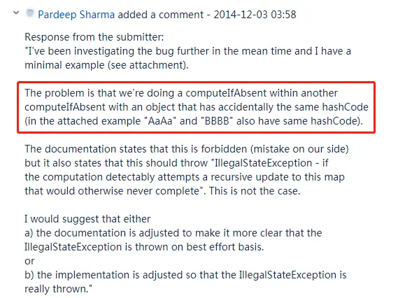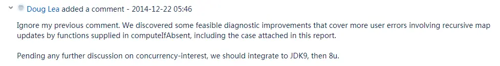 这次的回答可谓是峰回路转,他说:请忽略我之前的话。我们发现了一些可行的改进方法,这些改进可以处理更多的用户错误,包括本报告中所提供的测试用例,即解决在 computeIfAbsent 中提供的函数中进行递归映射更新导致死锁这样的问题。我们会在 JDK 9 里面解决这个问题。