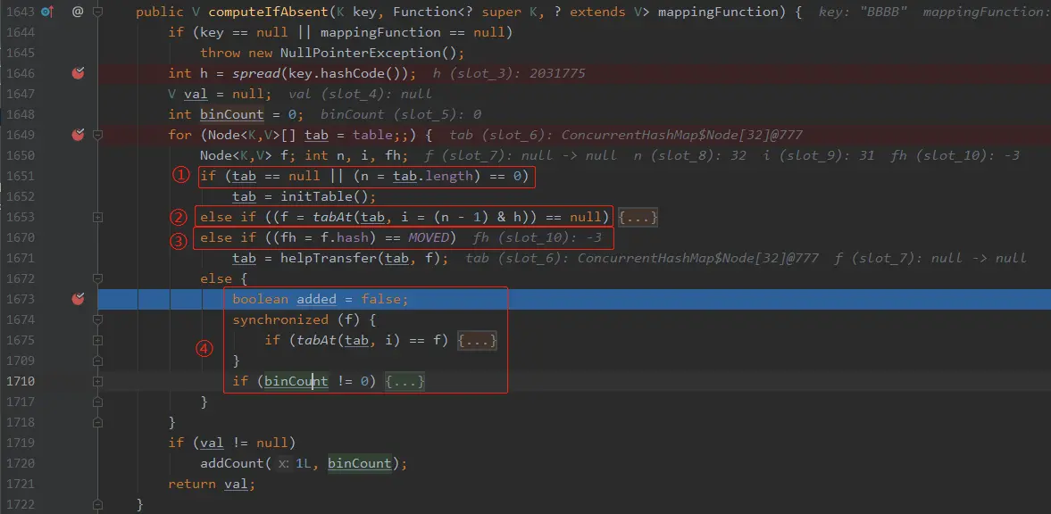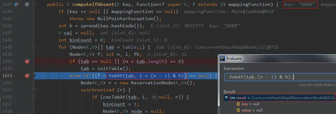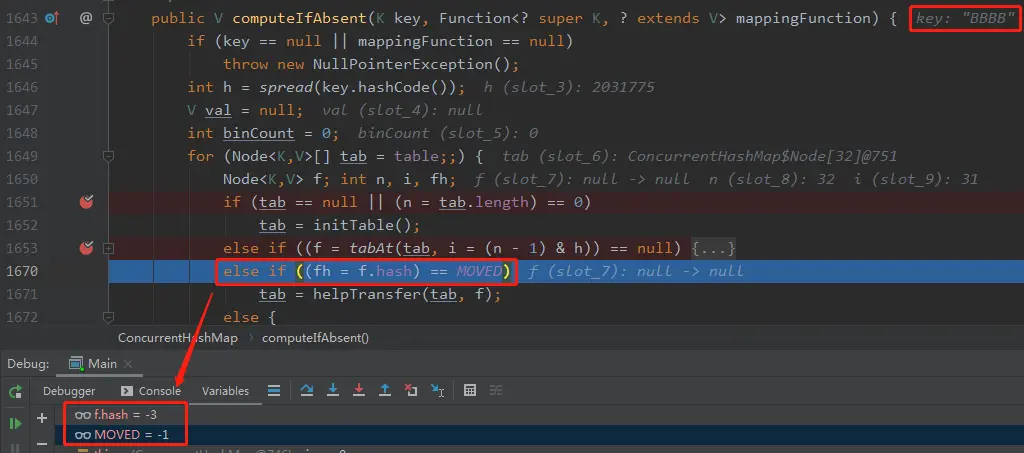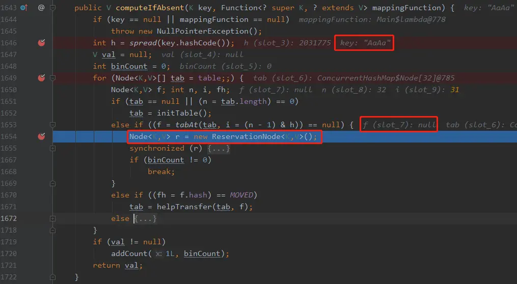 第 1678 行的 f 就是之前 “AaAa” 扔进去的 ReservationNode ,这个 Node 的 hash 是 -3,不等于MOVED(-1)。